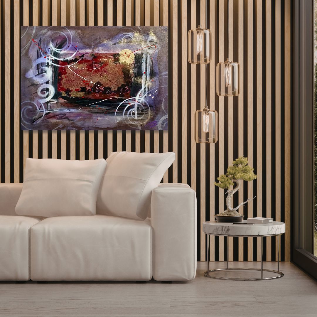 Das Werk zeigt ein pulsierendes Zentrum in Rot- und Goldtönen, umgeben von fließenden weißen Linien.